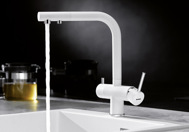 - Komfortable 3-in-1-Armatur mit Mischhebel rechts für Kalt- und Warmwasser sowie Drehgriff links für gefiltertes Wasser